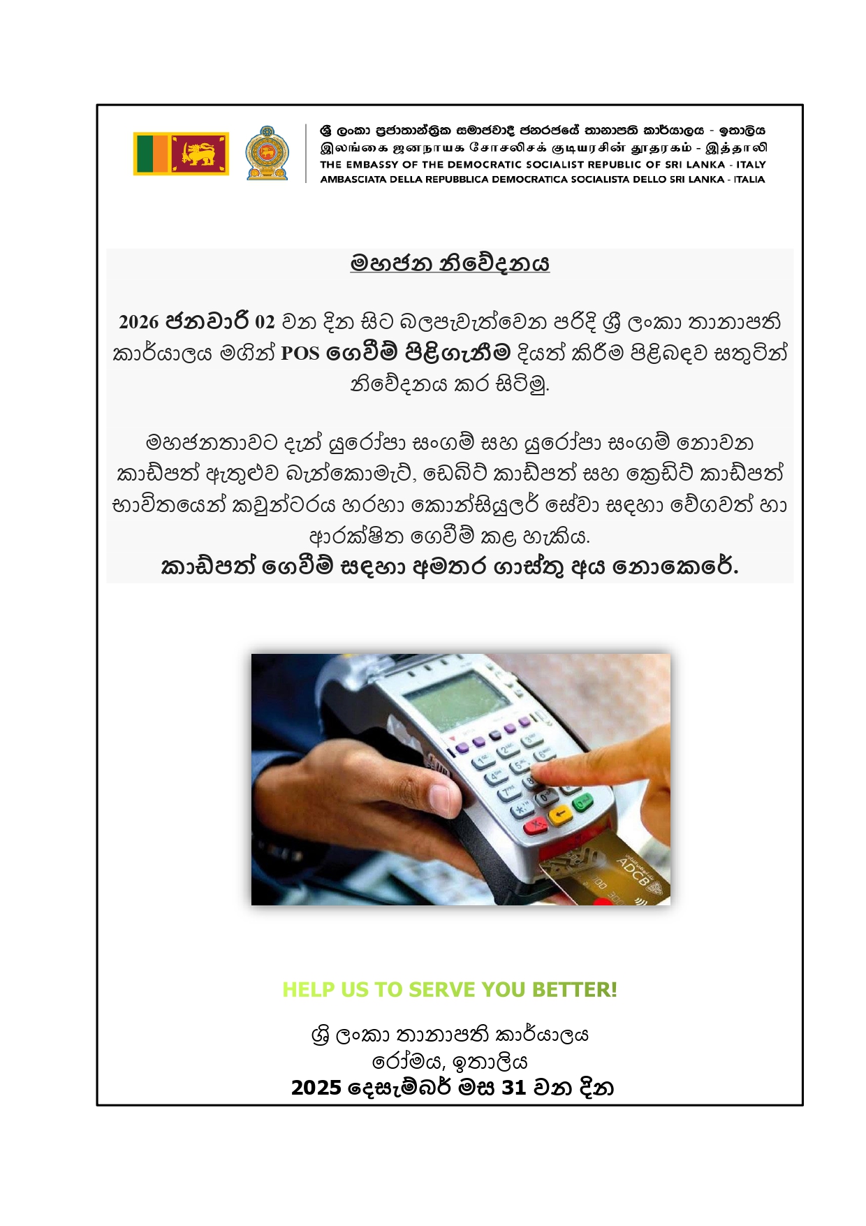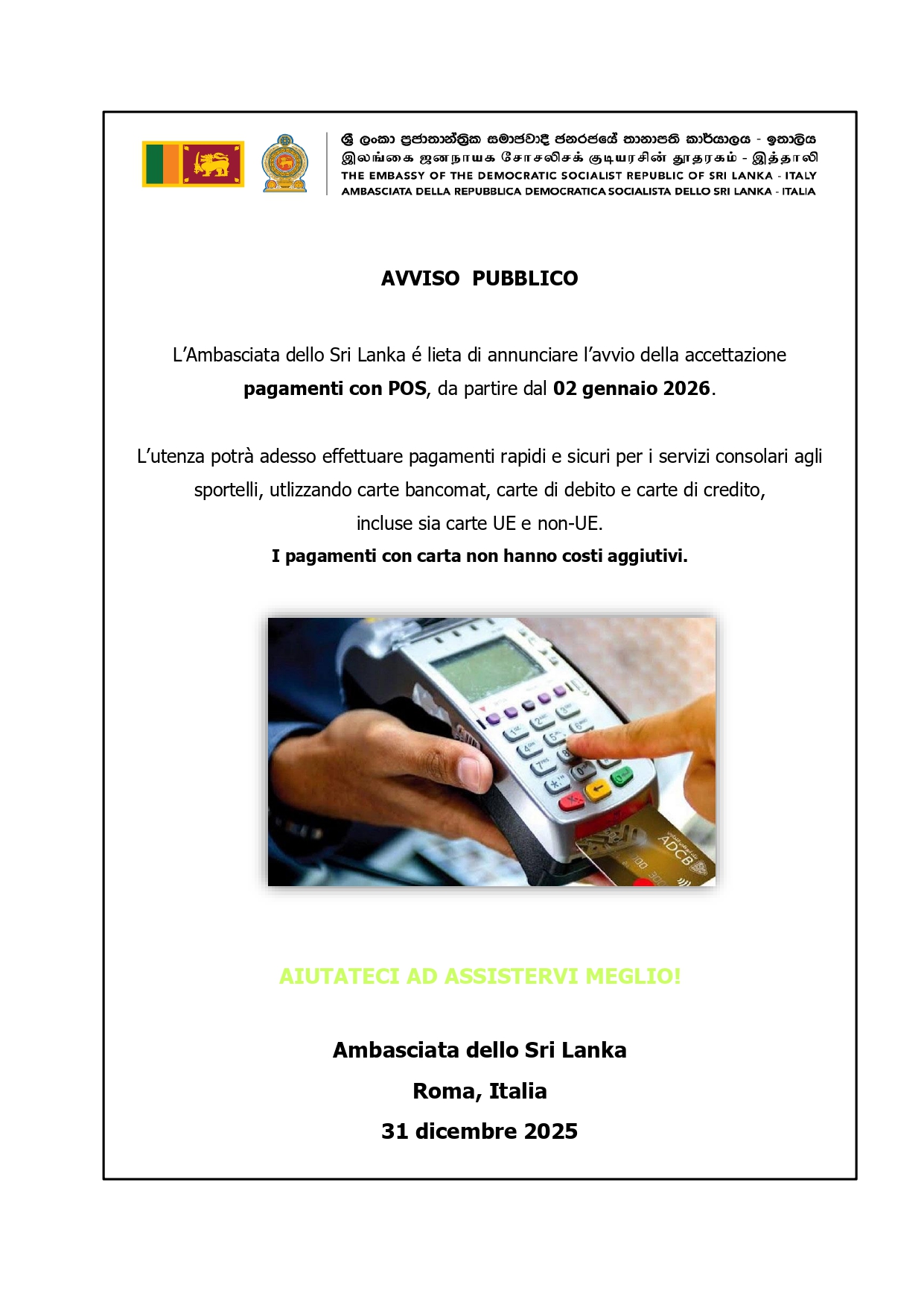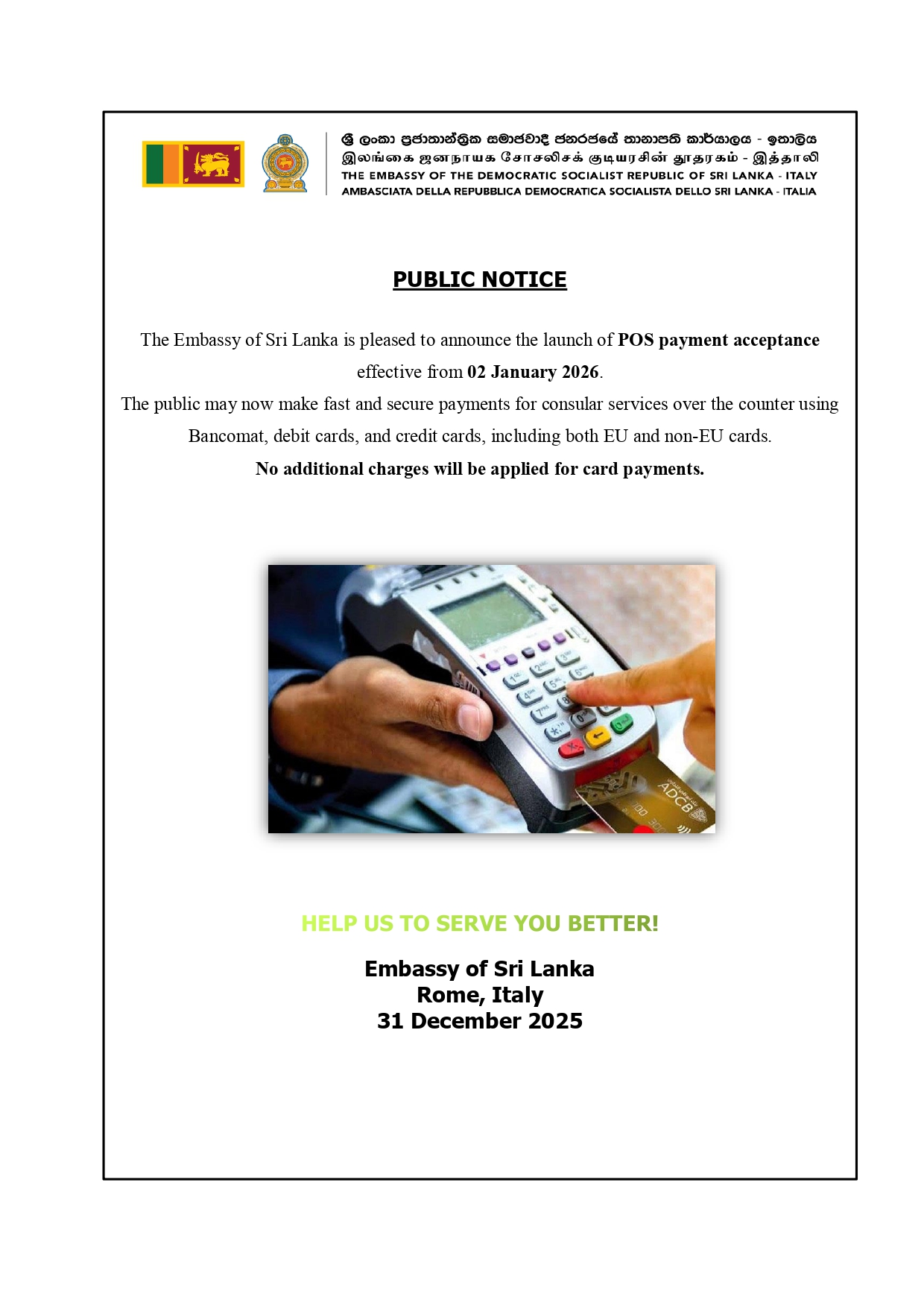 The Embassy of Sri Lanka is pleased to announce the launch of POS (Point of Sale) payment acceptance effective from 02 January 2026.