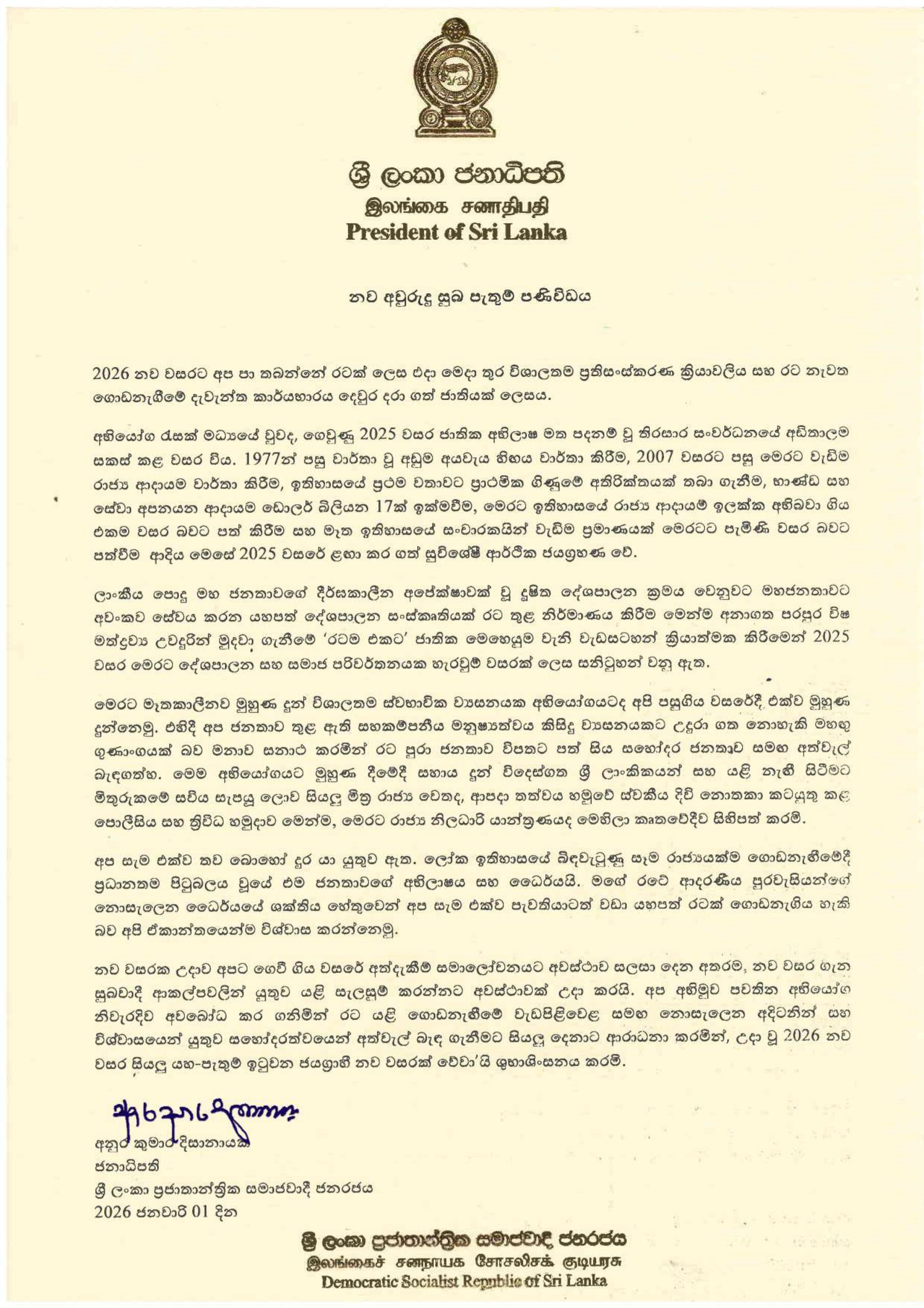 New Year Message from H.E. the President By Satya Rodrigo|2026-01-01T01:26:28+00:00January 1, 2026|Media Release, Recent News|0 Comments Share This Story, Choose Your Platform! FacebookXRedditLinkedInWhatsAppPinterestEmail Related Posts Sunday Consular Services 2026 Sunday Consular Services 2026 Embassy of Sri Lanka launches POS payment facility on 2 January 2026 Embassy of Sri Lanka launches POS payment facility on 2 January 2026 New Year Message from the Honorable Prime Minister New Year Message from the Honorable Prime Minister 2026 New Year Message of Minister of Foreign Affairs, Foreign Employment & Tourism 2026 New Year Message of Minister of Foreign Affairs, Foreign Employment & Tourism Leave A Comment Cancel replyComment Save my name, email, and website in this browser for the next time I comment.