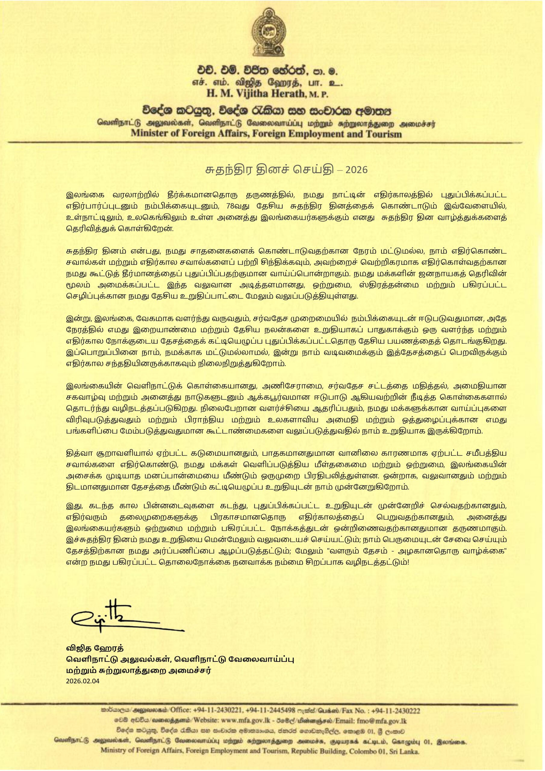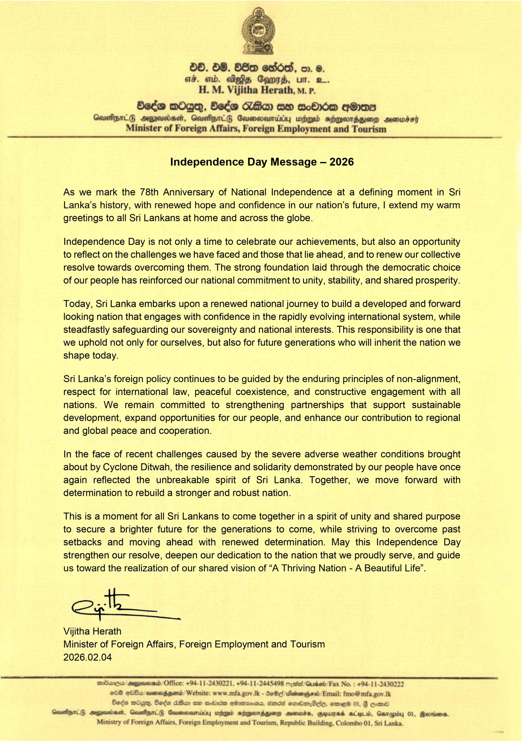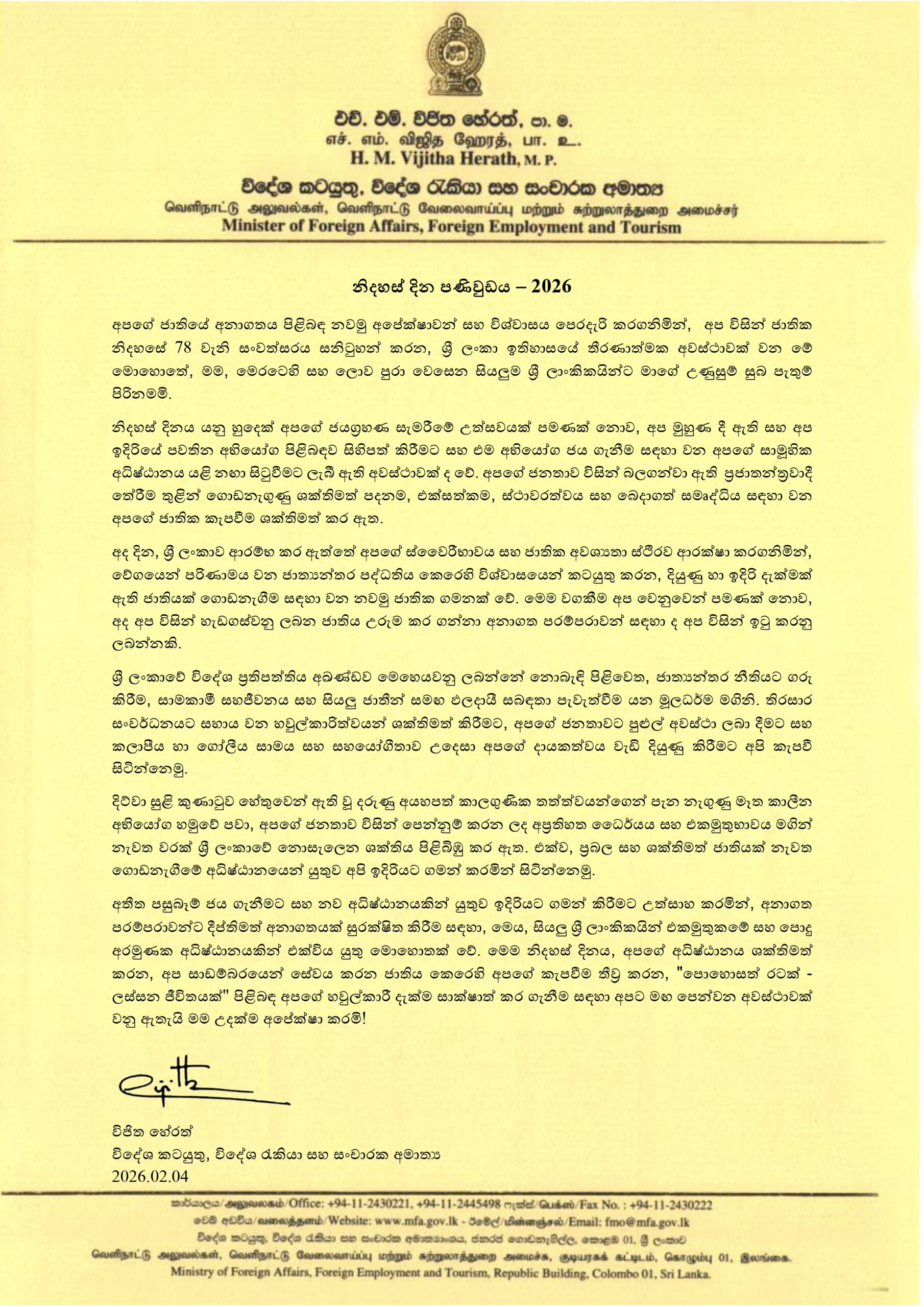 Message of Hon. Vijitha Herath, Minister of Foreign Affairs, Foreign Employment and Tourism on the 78th Independence Day